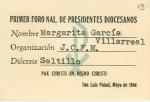| Gafete a nombre de Margarita García Villarreal como miembro de las juventudes católicas femeninas mexicanas de la diócesis de Saltillo. Se expide en San Luis Potosí, en mayo de 1964. |