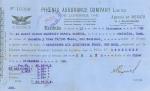 | "La compañía Phoenix Assurance Limited de Londres, Ing", representada en Saltillo por Guillermo Purcell y Compañía, expide recibo al doctor Mauricio García Barreda, por la cantidad de treinta y dos pesos oro nacional para asegurar la suma de 13,500 pesos oro nacional. La vigencia de la póliza será de un año. |