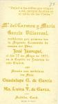 | Estampa de la primera comunión de las hermanas María del Carmen y María García Villarreal, hijas de Juan García y de Carmen Villarreal. Las niñas recibieron su primera comunión del presbítero José Jáuregui en la capilla de Lourdes de la ciudad de Saltillo. |