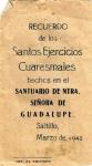 | Estampa de la Virgen María de Guadalupe, con un mensaje al reverso que dice: "recuerdo de los Santos ejercicios cuaresmales, hechos en el Santuario de Nuestra Señora de Guadalupe, Saltillo, Coahuila". |