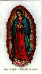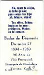 Estampa conmemorativa con la imagen de la virgen de Guadalupe con la frase "Reina de México y Emperatriz de América". Al reverso se puede leer una pequeña oración y la leyenda "Bodas de Diamante". En el mismo texto se especifica que es una celebración católica por cumplir 75 años de vida parroquial. Fechada el 27 de diciembre de 1894-1969, en la parroquia de Guadalupe en Torreón, Coahuila. |