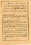 | Antonio Prieto dirige una "Carta Abierta" al doctor Luis Coyula expresándole su rechazo en su desempeño como servidor público. Destaca la línea: "¿Cuando usted era escritorzuelo de los periódicos huertistas tenía usted casa de su propiedad, negocitos, alhajas, automóviles, etc. etc.?" |