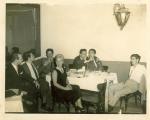 | Grupo de amigos y familiares alrededor de una mesa con botellas y vasos. De izquierda a derecha en la esquina Jesús Garza, a su lado Ricardo Villarreal y al último Jorge García. Los acompaña una mujer vestida de negro, con tacones, collar de perlas y aretes. |