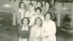 | Grupo de mujeres jóvenes. La mayoría viste suéter y una lleva pañoleta. En cuclillas de izquierda a derecha Tiche Arsuaga, Margarita Siller y Graciela Pérez. Atrás de pie a la izquierda Margarita García Villarreal. Al fondo se observan unos arcos y del techo cuelgan una uvas. |