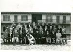 | Fotografía de un grupo de hombres en cursillos. Sentados al frente se aprecian varios sacerdotes. El primero de derecha a izquierda es Jorge García Villarreal. Se observa un perro labrador y al fondo unos departamentos. |
