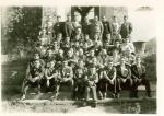 | Grupo de hombres en cursillos en la ciudad de Cholula, Puebla. Se encuentran sentados en unas escaleras. Al fondo se observan plantas. Al reverso se anotan los nombres de: Manuel Fletes, Joaquín Rivera, Roque González Garza, Federico Legorretea y Germán Dehesa. |
