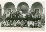 | Grupo de hombres en cursillos en Fresnillo, Zacatecas. En la segunda fila se aprecian varios sacerdotes. Al fondo se ve una construcción con arquería. |