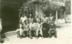 | Grupo de 10 hombres de pie y sentados acompañados por un sacerdote. Atrás se aprecia una casa con enredadera. |