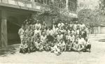 | Grupo de hombres sentados y de pie. Al centro en la segunda fila se ve a un sacerdote. Al fondo se ve una construcción, una enredadera y un árbol. |