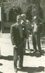 | Fotografía de cuatro hombres. El de adelante mira de frente y los tres de atrás se encuentran platicando. Al fondo ventanas con arcos y una enredadera. |