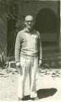 | Hombre de frente. Se encuentra de pie y viste suéter. Lleva anteojos. Al fondo una construcción con una ventana en forma de arco. |