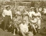 | La familia García Villareal y cónyuges en Cuernavaca, Morelos. Las mujeres visten rebozo y los hombres sombrero. Sentado al frente Francisco Garza. Sentadas a la izquierda Mercedes Villarreal de Galindo y Sofía Dávila de Villarreal. De pie empezando por la derecha los hermanos Carmen, Ricardo y María Luisa Villareal. De izquierda a derecha Alfredo Villareal y su esposa Concepción Mellado. Se encuentran en un jardín con plantas y árboles. |