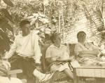| Los hermanos Ricardo, Carmen y María Luisa Villarreal. Se encuentran sentados. Carmen, enemedio tiene un sombrero y un rebozo en el regazo. Al fondo un muro con enredaderas. |