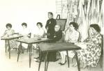 | Fotografía de un grupo de señoras reunidas con un sacerdote y el obispo de Saltillo. La segunda de izquierda a derecha es Enriqueta de la Garza de Aviles, a su lado Margarita García Villarreal, enseguida el Obispo Luis Guizar Barragan. De pie el padre Antonio Usabiaga. El lugar se compone de tres mesas, sillas y un pizarrón. Al fondo varios estandartes. |