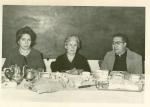 | Carmen Villarreal de García al centro comparte la comida con otra señora y el padre Carlos López. Los tres se encuentran sentados frente a una mesa, en la que se observan galletas, un pastel, jarras y tazas. |