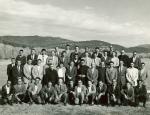 | Grupo de hombres en ejercicios espirituales en Pecos, Nuevo México en el mes de octubre. Varios sacerdotes integran el grupo. Jorge García es el primero a la izquierda en la tercera línea. Al fondo se aprecian una lomas con árboles. |