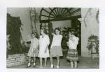 | Grupo de niñas de la familia García Villarreal en un bailable en el patio de la casa de sus abuelos maternos en Saltillo. La primera de derecha a izquierda es Teresa Rodríguez, le sigue Elsa Rodríguez, Magdalena Sofía Cárdenas y al último Martha Rodríguez. Las cuatro visten faldas y suéter. Dos de ellas traen balerinas. Al fondo y al lado un zaguán y un arriate. |