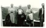 | Fotografía de un grupo de amigas durante su viaje a Europa, Medio Oriente y Oriente. Las tres cargan en sus brazos impermeables. La primera de derecha a izquierda es Carmen Villarreal de García, la sigue Ángela Ramos de Espinoza Mireles y al último Guadalupe López. A su lado un hombre con saco. Al fondo unas montañas y un río. |
