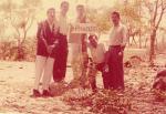 | Grupo de cinco hombres enmedio del campo. Muestran un letrero que dice "monasterio". Al fondo se aprecia un carro. |