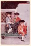 | Retrato de los hermanos García Garza disfrazados de toreros. Al frente Rodolfo, Rolando, el más pequeño con capa, y a su lado Hernán el mayor. Se encuentran sobre un carrito con una piñata en forma de toro. Al fondo una barda. |