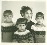| Fotografía de la familia García Garza. Al frente el niño Rolando García a su izquierda su hermano Rodolfo, le sigue su mamá María Angélica Garza de García y por último Hernán García Garza. Los niños traen suéter. |