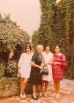 | Tres generaciones García Villarreal. De izquierda a derecha Magdalena Sofía Cárdenas a su lado su abuela Carmen Villarreal de García, de blanco su mamá Carmen Villarreal de Cárdenas y vestida de rojo su hermana Carmen Cárdenas Villarreal. Traen vestidos cortos. Se encuentran en el patio de la casa de la familia García Villarreal. Al fondo se ve una enredadera y al lado un arriate |