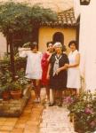 | Tres generaciones de la familia Villarrel García. De derecha a izquierda Carmen García de Cárdenas a su lado su mamá Carmen Villarreal, de rojo su hija Carmen Cárdenas y de blanco su hija Magdalena Sofía Cárdenas. Al fondo se aprecia una enredadera y a los lados macetas. |