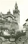 | Fotografía de un paseo en una calandria. Al frente el matrimonio de los Santos, al fondo las hermanas Carmen y María Luisa Villarreal. Se ve una iglesia y el techo de una casa. |
