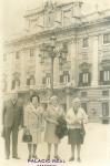 | Fotografía al frente del Palacio Real en Madrid, de Melchor de los Santos y Aída Ordóñez y de las hermanas Carmen y María Luisa Villarreal. Al fondo se observa la fachada del Palacio Real, en el remate se ve un reloj. |