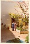 | Sofía Dávila de Villarreal vestida de pantalón, al lado su cuñada Carmen Villarreal de García. Se encuentran en el patio de la casa de la familia García Villarreal. Al lado se observa un arriate con plantas y al fondo una enredadera con flores amarillas. |