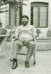 | Jorge García Villarreal, sentado en una mecedora en el patio de su casa. Trae reloj, barba y bigote. Al fondo se aprecia una fuente con plantas y dos ventanas de madera. |