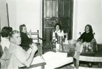 | Grupo de la familia Villarreal García en el comedor del rancho de Flores en Saltillo, Coahuila. De izquierda a derecha Javier García Villarreal al lado su hermana Carmen García, la tercera fumando su esposa Mae Narro de García, de frente con chaleco, su hermana María García de Rodríguez y la última su prima Martha Arsuaga de Reyna. |