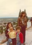 | Los hermanos Patrón Galindo en el mirador de la parte alta de una ciudad. De pie Mónica Patrón, en cuclillas su hermana Leticia y con suéter rojo Juan Felipe. Junto a ellos un niño pequeño. |