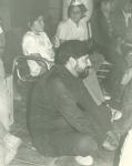 | El Sacerdote Jorge García Villarreal sentado en el piso en la "Casa Hogar de los Pequeños", en Saltillo, Coahuila. A su lado algunos niños. |