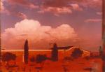 | Cuatro vistas del rancho de Flores en Saltillo, Coahuila. La primera es una pequeña barda de adobe con flores, la segunda un lado de la casa de adobe, la tercera una carreta con macetas y al fondo la huerta y la última un papalote. |