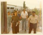 | El padre Jorge García Villarreal al lado de la señora Paloma Cordero de de la Madrid, entrando a la "Casa Hogar de los Pequeños" en Saltillo, Coahuila. Atrás unos guardaespaldas. Al fondo un grupo de personas y unas construcciones. |