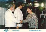 | El capitán del barco "Scandinavia" saluda a Margarita García Villarreal. Viste una blusa de rombos, lleva collar y aretes. |