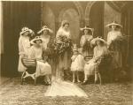 | Retrato de Carmen García Villarreal el día de su boda con Juan García González el 12 de octubre de 1922 en la catedral de Saltillo, Coahuila. Se acompaña por sus damas y una niña. De derecha a izquierda la joven es su cuñada Josefina García y la niña su sobrina política María de la Luz García Ramos. La novia carga un gran ramo de flores lo mismo que las damas. El escenario se compone de dos bancas y una alfombra. El telón de fondo simula unos arcos y unas cortinas. |
