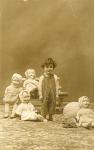 | Retrato de Carmen García Villarreal, de aproximadamente dos años, de pie y vestida de overoll a rayas. La acompañan sus muñecas, una pelota y un carrito en forma de conejo. El lugar se complementa con una banquita y una alfombra. |