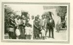 | Retrato de los hermanos Villarreal García acompañando a unos novios. También aparecen los hijos de Carmen Villarreal, Carmen, María y Javier García. La familia se encuentra en el patio de la casa de la familia Villarreal García. Al fondo se ven los arriates y una fuente. |