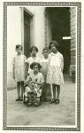 | Grupo de niños posando con un perro. De derecha a izquierda aparecen los hermanos Carmen, Javier y María García Villarreal. |