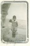 | Retrato del niño Jorge García Villarreal, con pantalones bombachos y botas. Se encuentra en posición de saludo a la bandera. |