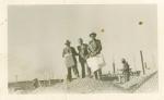 | Fotografía de tres hombres en el inicio de la construcción de Altos Hornos de México. De izquierda a derecha con sombrero y un plano en la mano Juan García González. |