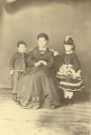 Dolores Fuentes de Rodríguez elegantemente vestida. Se encuentra sentada en una silla acompañada por sus hijos María de Jesús y Román, quienes se encuentran de pie. |