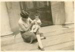 | María Guadalupe García Rodríguez con su pequeña hija María Eugenia Viesca. Se encuentran sentadas en una banqueta frente a un puerta. |