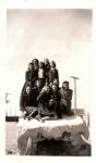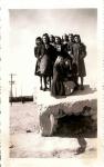 | Grupo de mujeres posando sobre las ruinas de una construcción, todas llevan abrigos y una de ellas lleva la cabeza cubierta con gorro. |