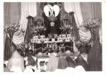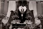 | Fotografías del "Monumento al Santísimo" del Jueves Santo, está rodeado de flores y el pelícano rasga su pecho para que sus polluelos beban su sangre. En una de las fotografías se observan mujeres orando, todas llevan velo. |