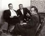 | Fotografía de cuatro hombres entre los que se encuentran Abelardo Fernández y José Antonio de la O, uno tiene en su mano un vaso con agua y otro un cigarro, todos visten traje. |
