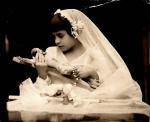 | Fotografía de Dora de la O el día de su primera comunión, posa inclinada hacia un cristo, lleva un rosario en su mano |