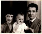 | Fotografía de la familia Luján Ortiz. Consuelo lleva vestido a rayas y chinos, su esposo traje y corbata oscura, el bebé sonríe a la cámara. Al reverso se lee: "para la familia de la O con todo nuestro sincero cariño". Fechada el 5 de diciembre de 1939 |